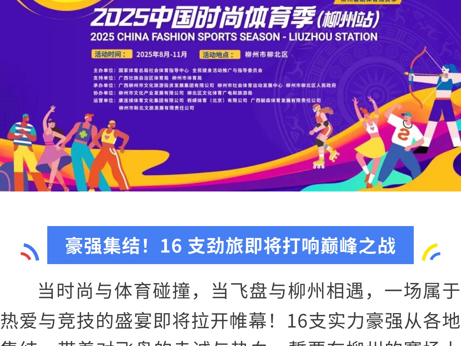 燃動柳州!中國時尚體育季飛盤邀請賽16豪強集結,九支勁旅先睹為快 發(fā)布時間:2025年09月30日 16時來源:本站原創(chuàng)瀏覽:65 人次
