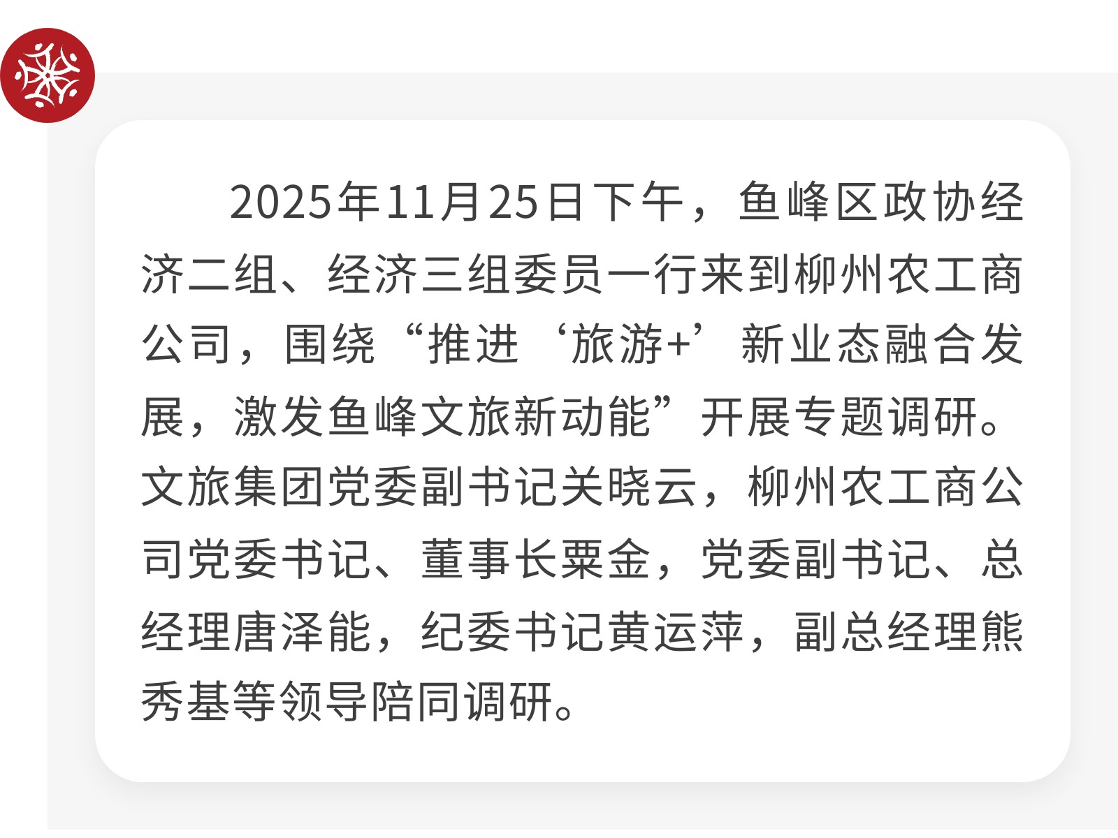 【政協(xié)來“把脈”,文旅添“動能”】魚峰區(qū)政協(xié)專題調研農工商公司 發(fā)布時間:2025年11月28日 09時來源:本站原創(chuàng)瀏覽:63 人次