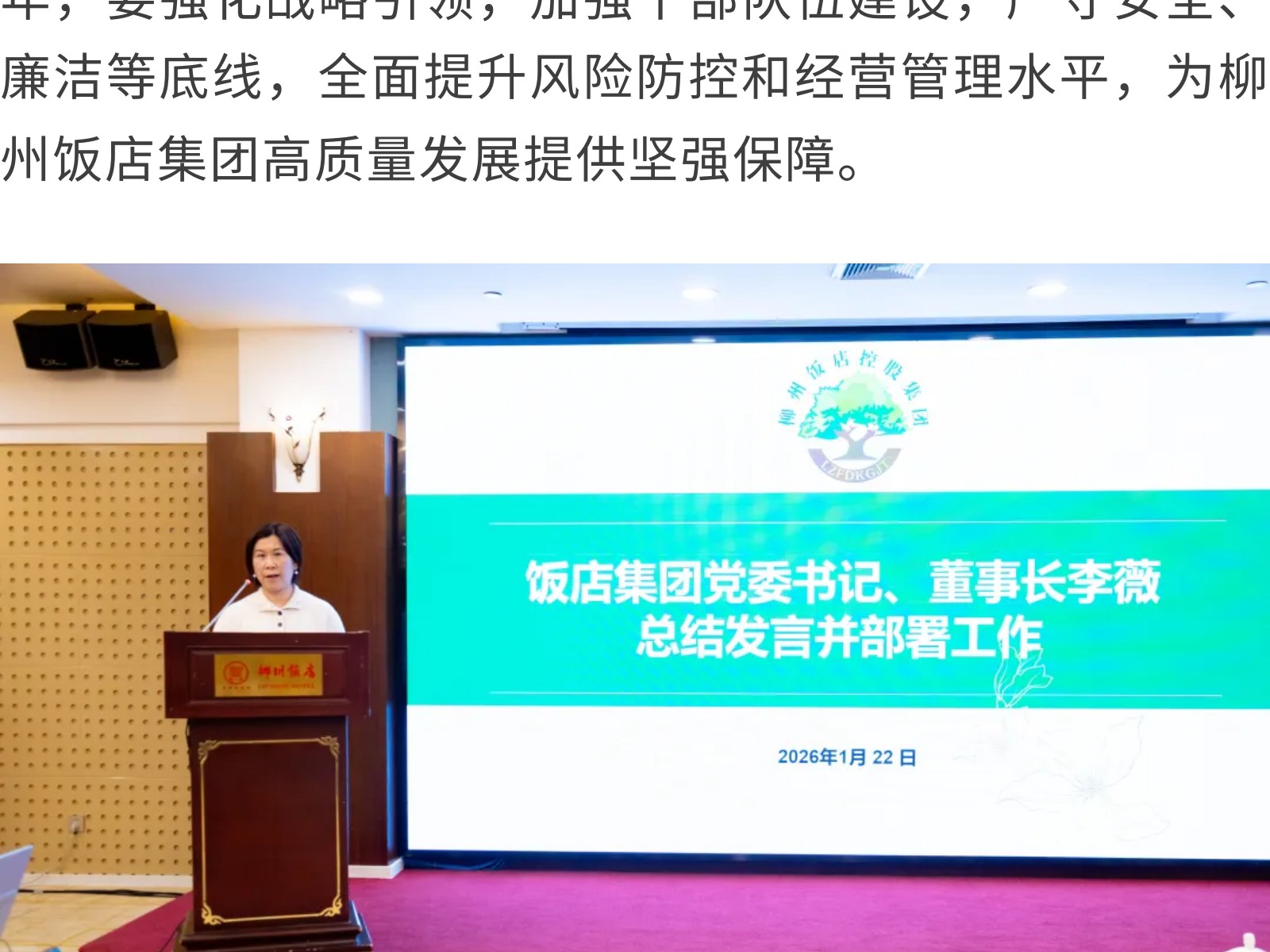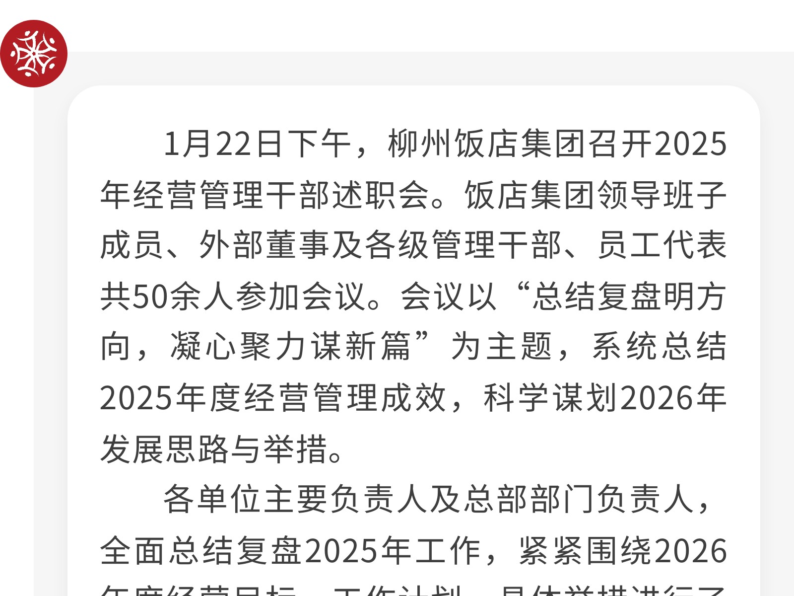述職亮答卷,乘勢開新局——柳州飯店集團召開2025年經(jīng)營管理干部述職會 發(fā)布時間:2026年01月29日 10時來源:本站原創(chuàng)瀏覽:48 人次