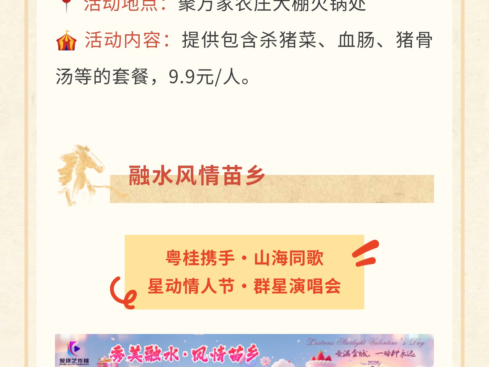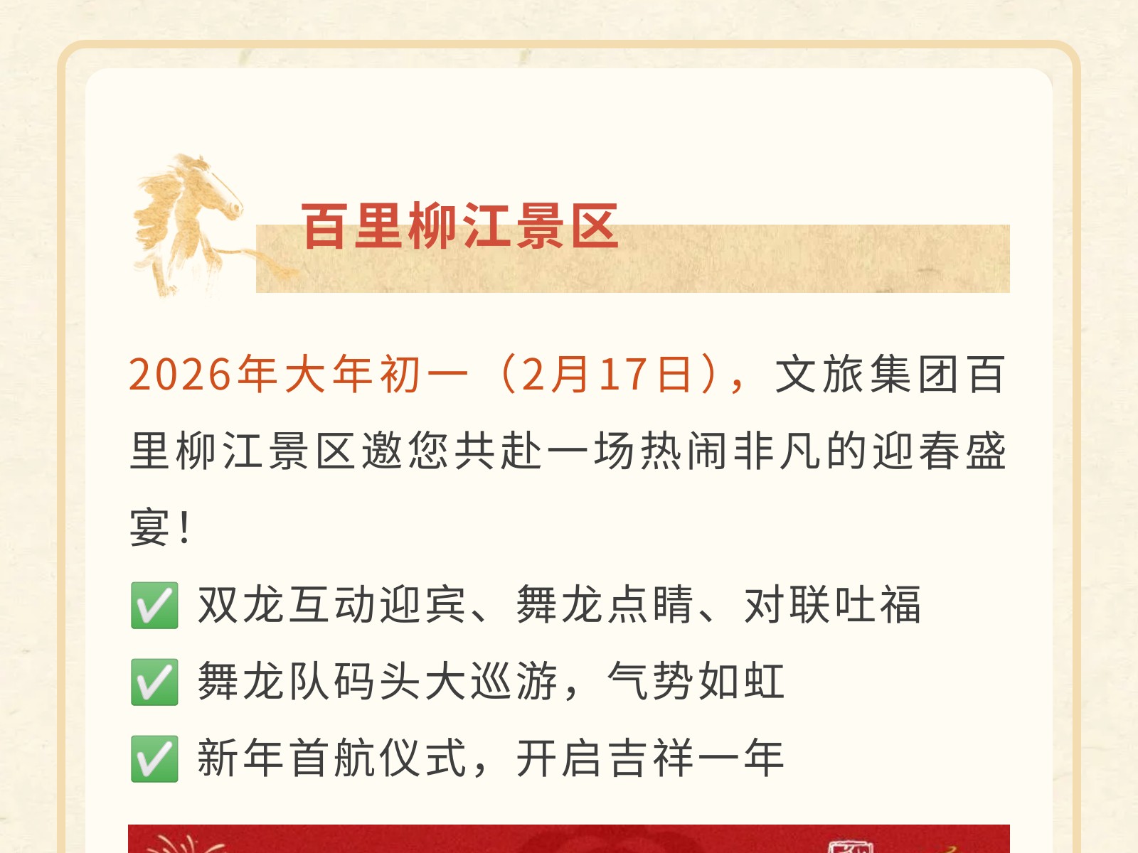 【駿馬奔騰·文旅賀歲】2026文旅集團(tuán)新春游樂(lè)指南,承包你的團(tuán)圓與歡樂(lè)! 發(fā)布時(shí)間:2026年01月30日 15時(shí)來(lái)源:本站原創(chuàng)瀏覽:55 人次