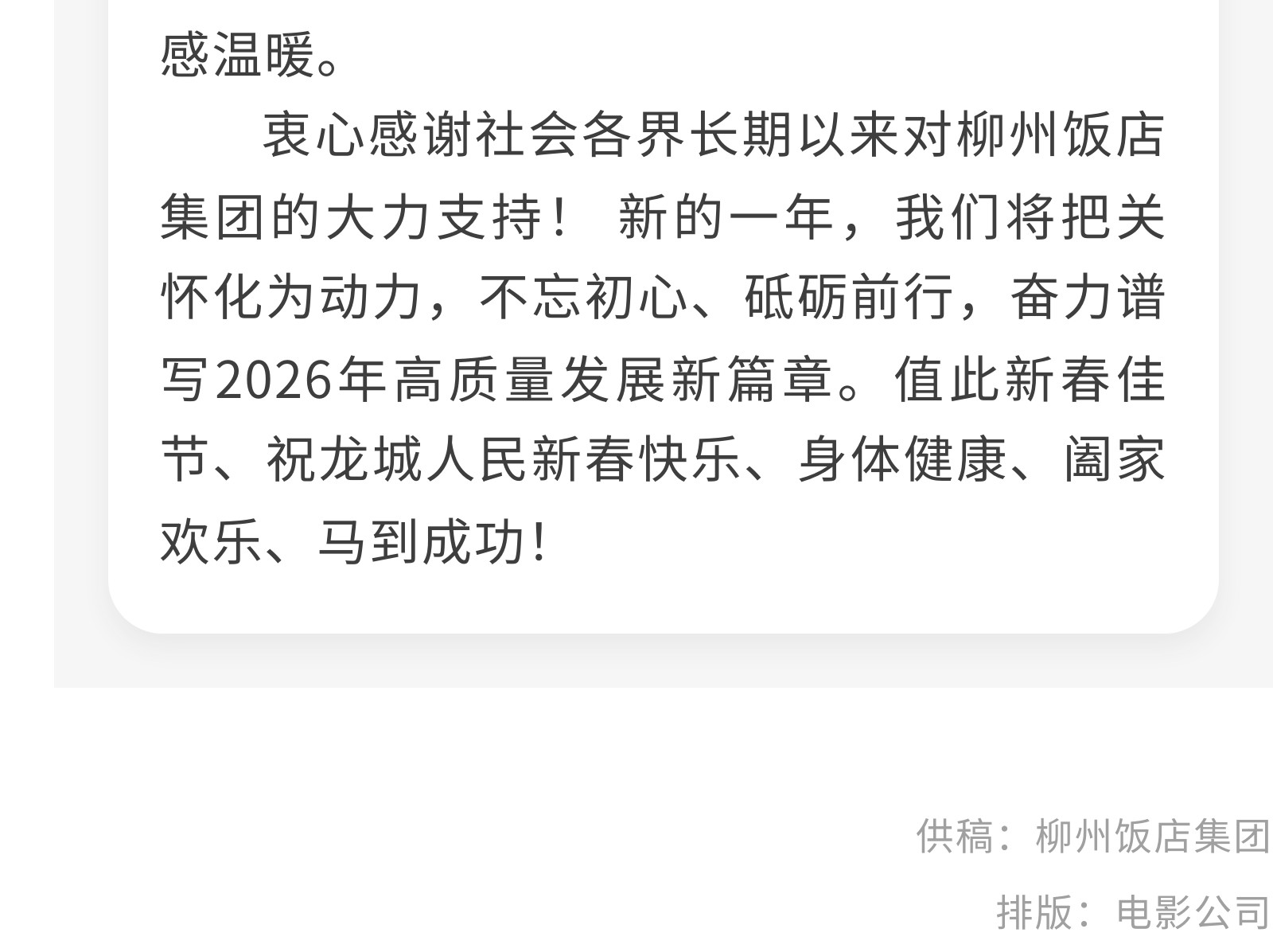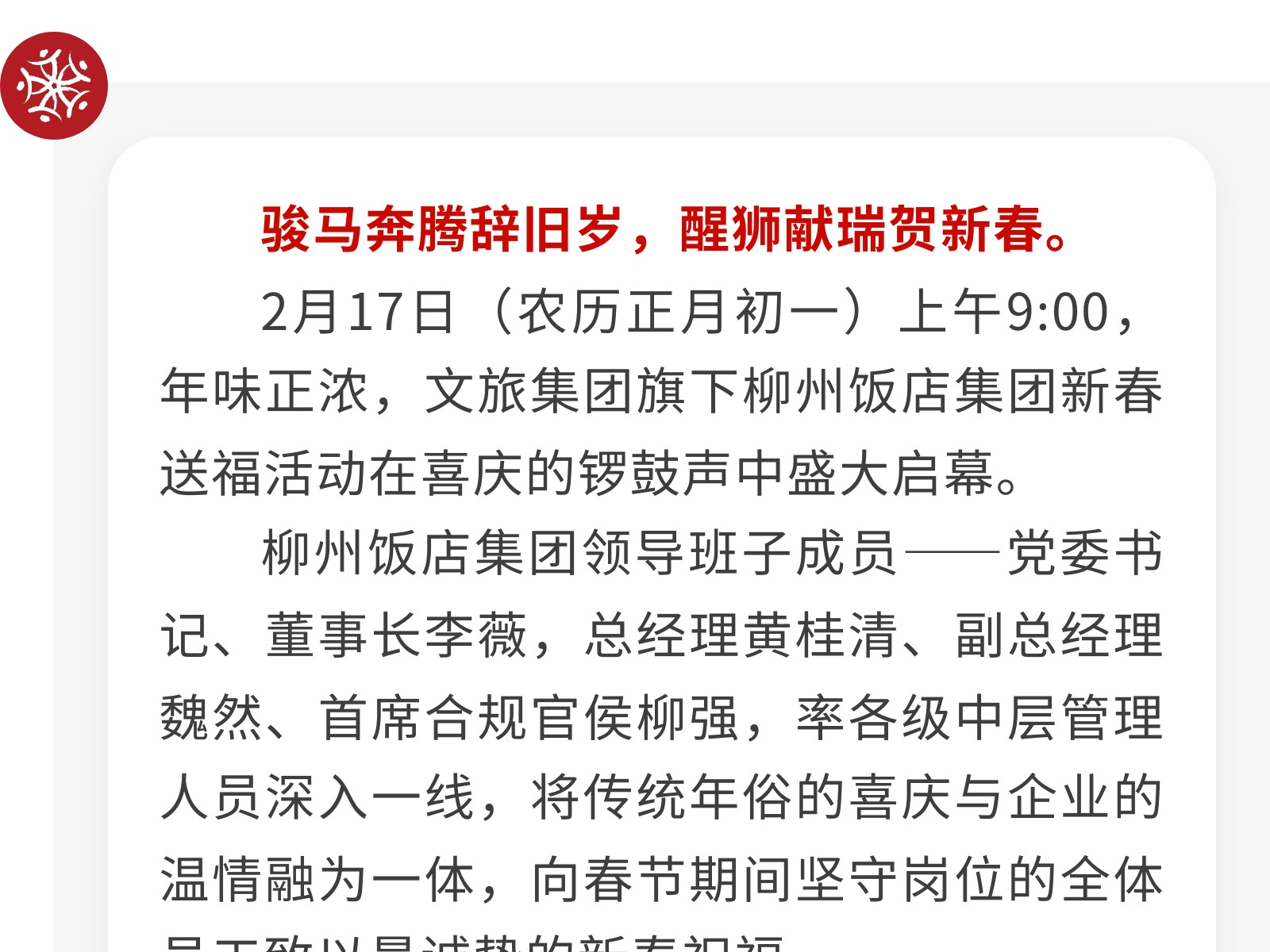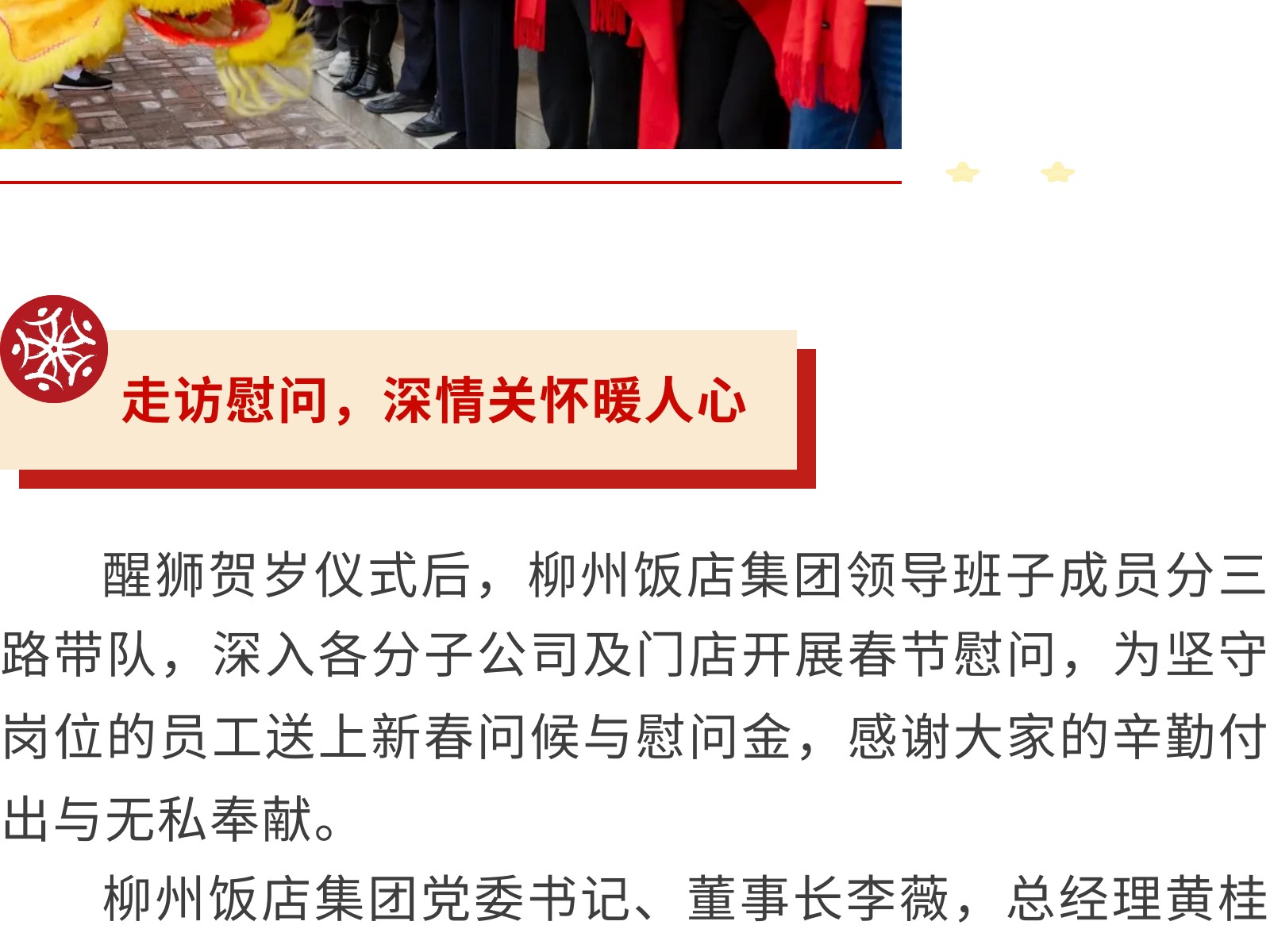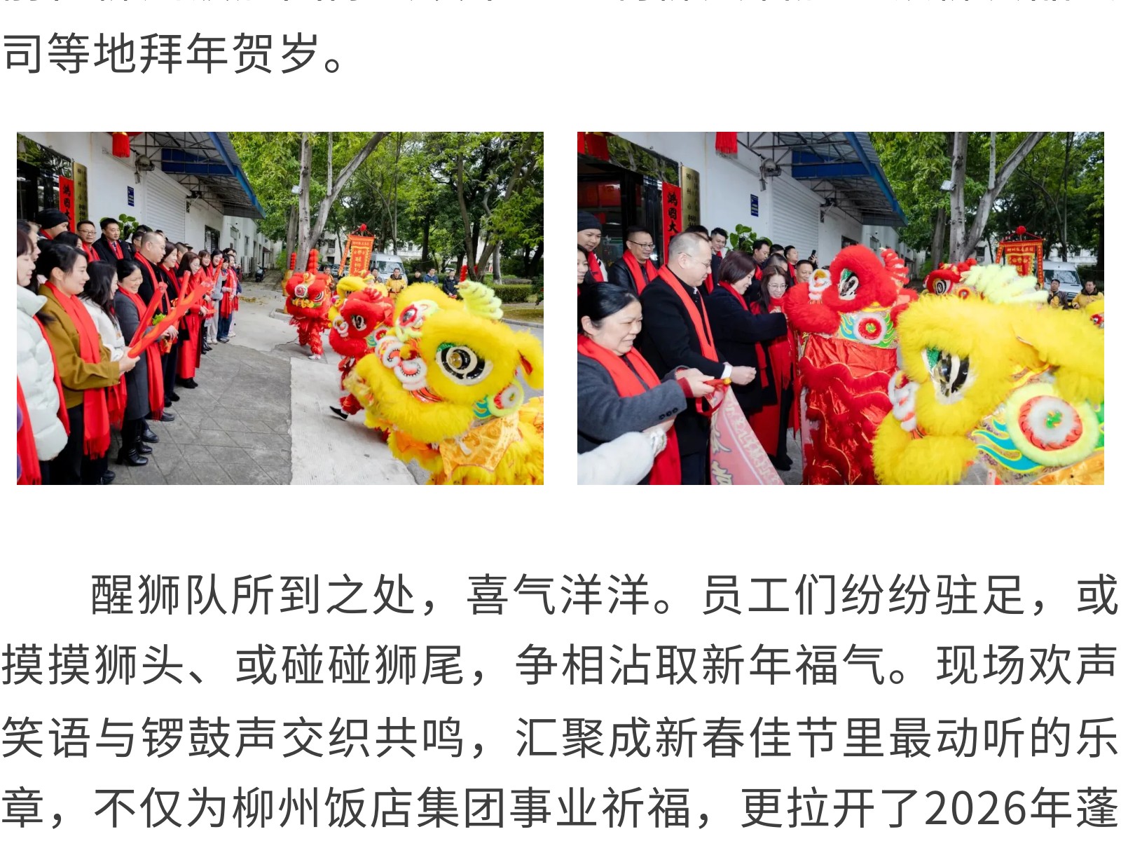 龍騰獅躍賀新春,情暖一線送福至——柳州飯店集團開展2026年新春送福慰問活動 發(fā)布時間:2026年02月24日 13時來源:本站原創(chuàng)瀏覽:38 人次